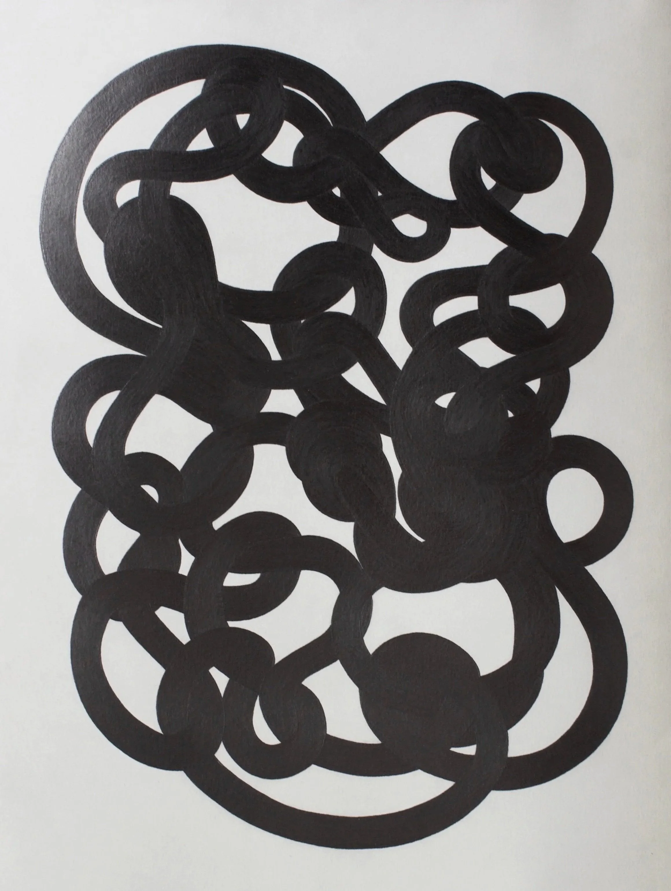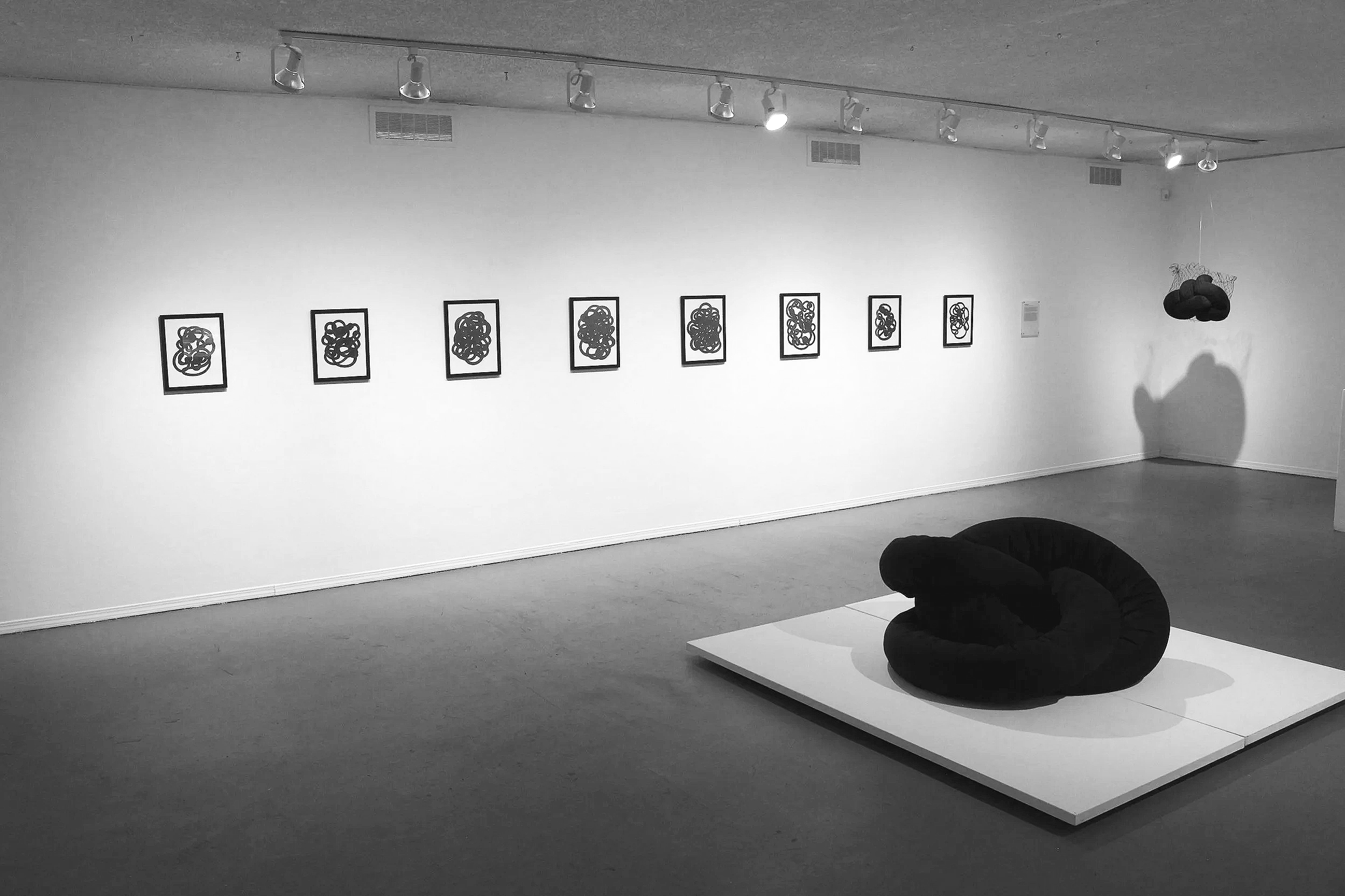 Knotty Enigmas is a collection of drawings and soft sculptures that reflect the body’s gut response to trauma. This series of “memory-knots” pulls from the artist’s own relationship with cell memory, and has been informed by a level of her own introception (a sense of the internal state of the body). These dark, heavy, interwoven forms aim to articulate the ways in which trauma is held and carried in the body as a weighted, somatic experience, and how this accumulates over time. The drawings are built up in layers of graphite which reflect the ways in which complex trauma is cumulative and therefore ever-evolving, as new and recurring traumas continue to pile up and go unprocessed, and past memories are triggered and re-intensified. The soft sculptures bring these notions further into a bodily realm through their overwhelming, colossal sense, and through the tangible weight they visibly carry. While certain “knotty enigmas” are non-infinite, others are infinite loops which pose an added complexity should they be attempted to be unraveled. Through these ambiguities and abstractions, these enigmas further challenge both the artist and the viewer to find their way through these knots, and to confront what arises in the process.