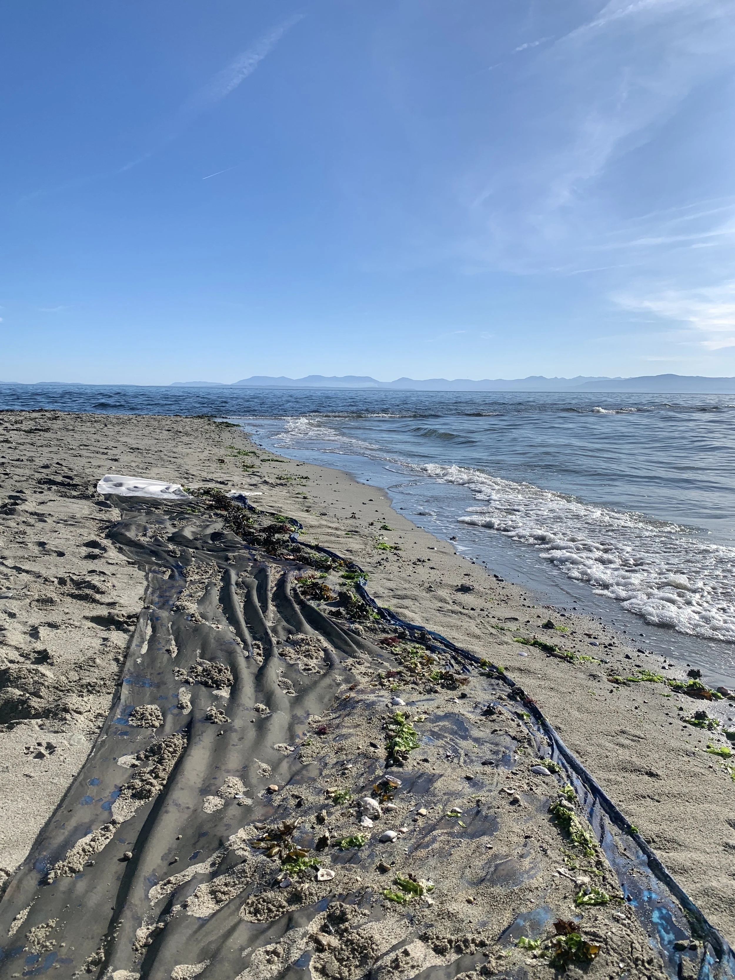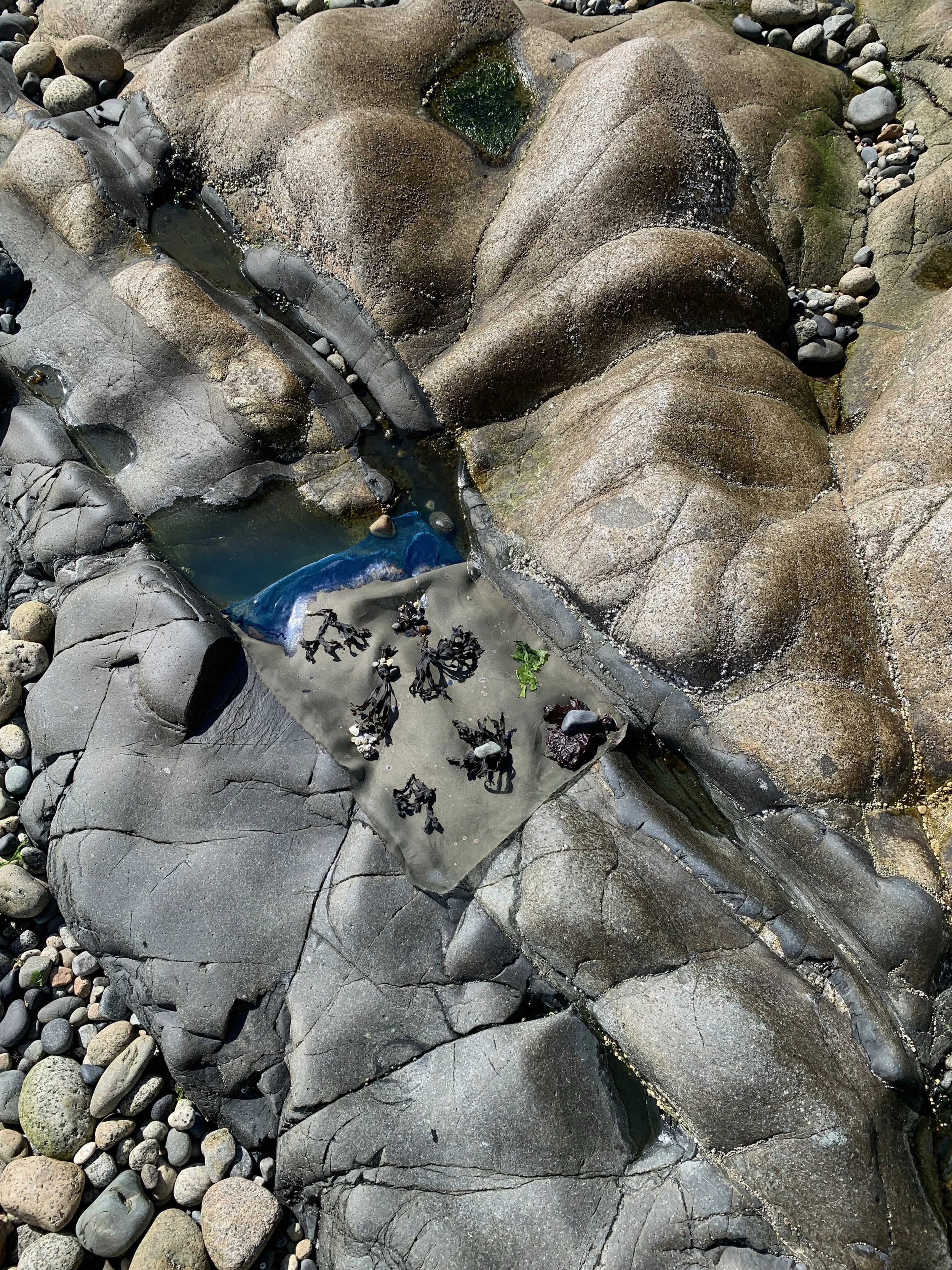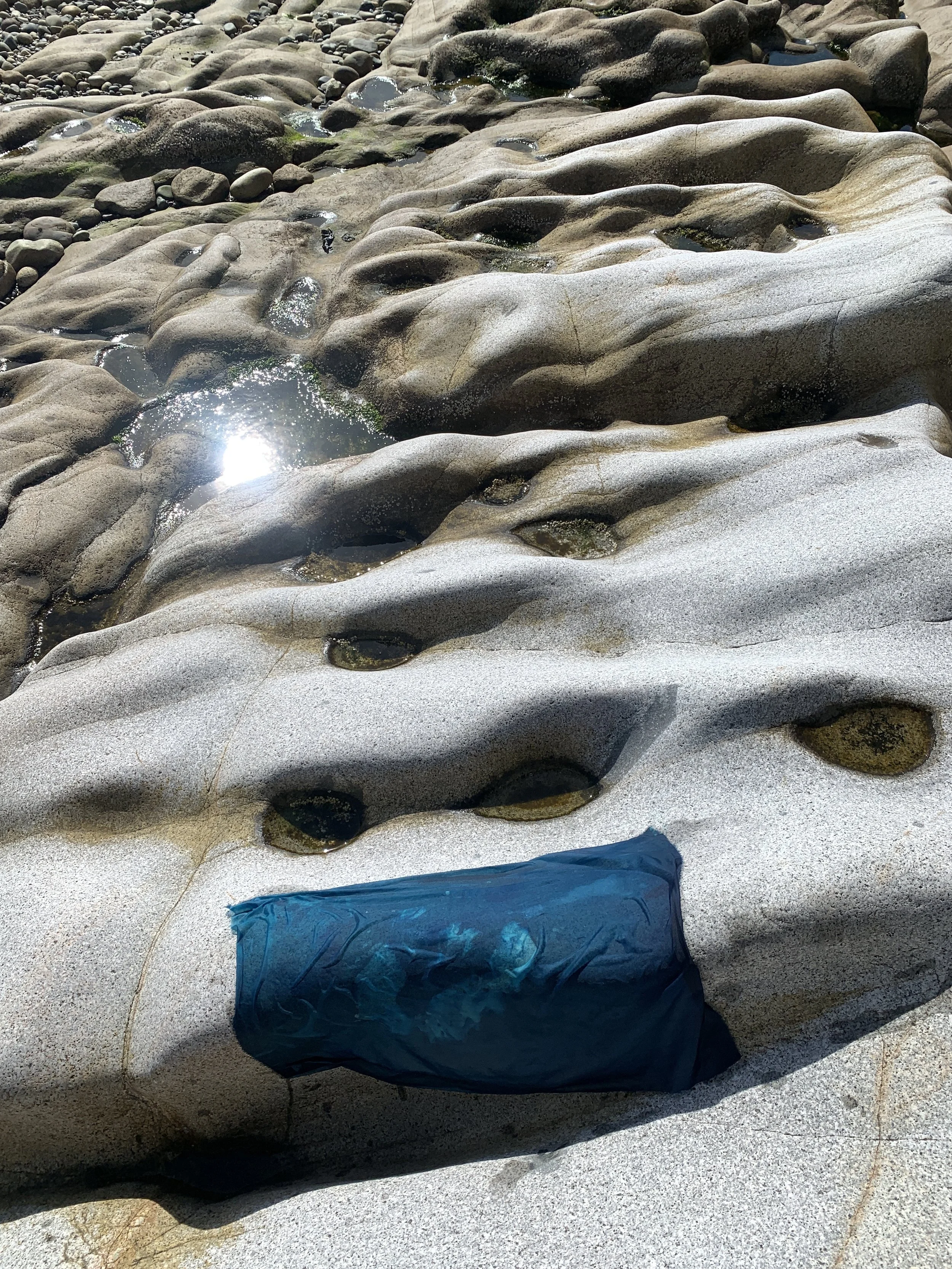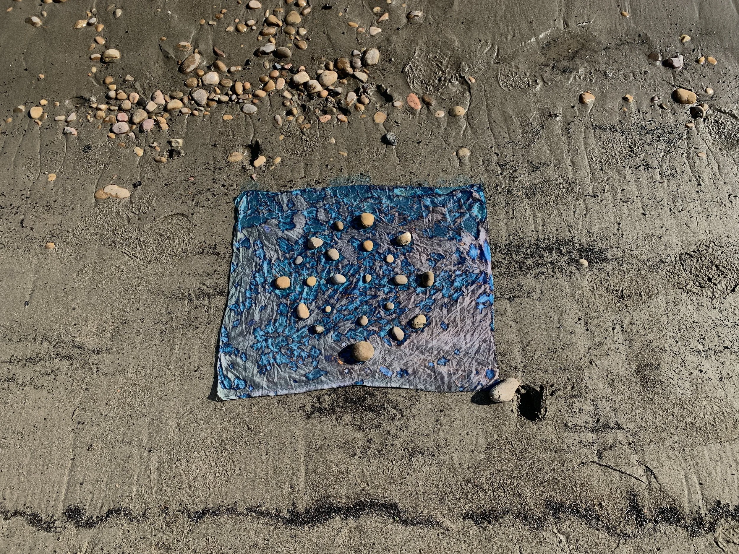 Through the cyanotype process, these works become an Earth Altar—a practice of giving reverence to the land by collecting and placing materials from the shoreline onto the cloth. The fabric is then exposed under the sun, layered with sand, water, seaweed, shells, rocks, and the delicate traces of crabs and other creatures who briefly crossed its surface. These impressions hold the memory of ephemeral moments—captured yet still fluid, marked in deep blue.